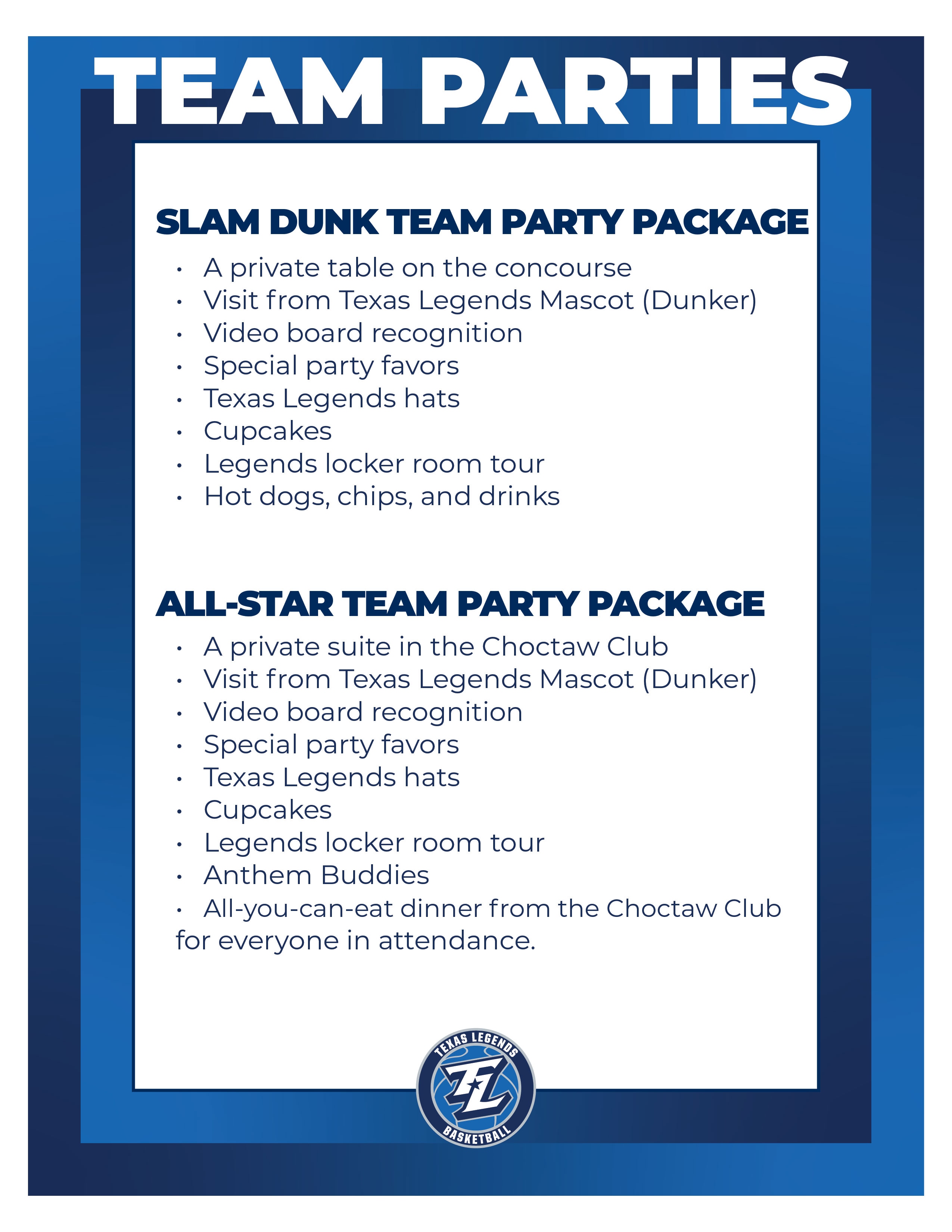 Host your team's next party at a Texas Legends game! Enjoy your own party table and zone, exclusive team experiences, and a night of thrilling basketball action!! Our dedicated staff will handle all the details, ensuring a memorable event for your entire group.