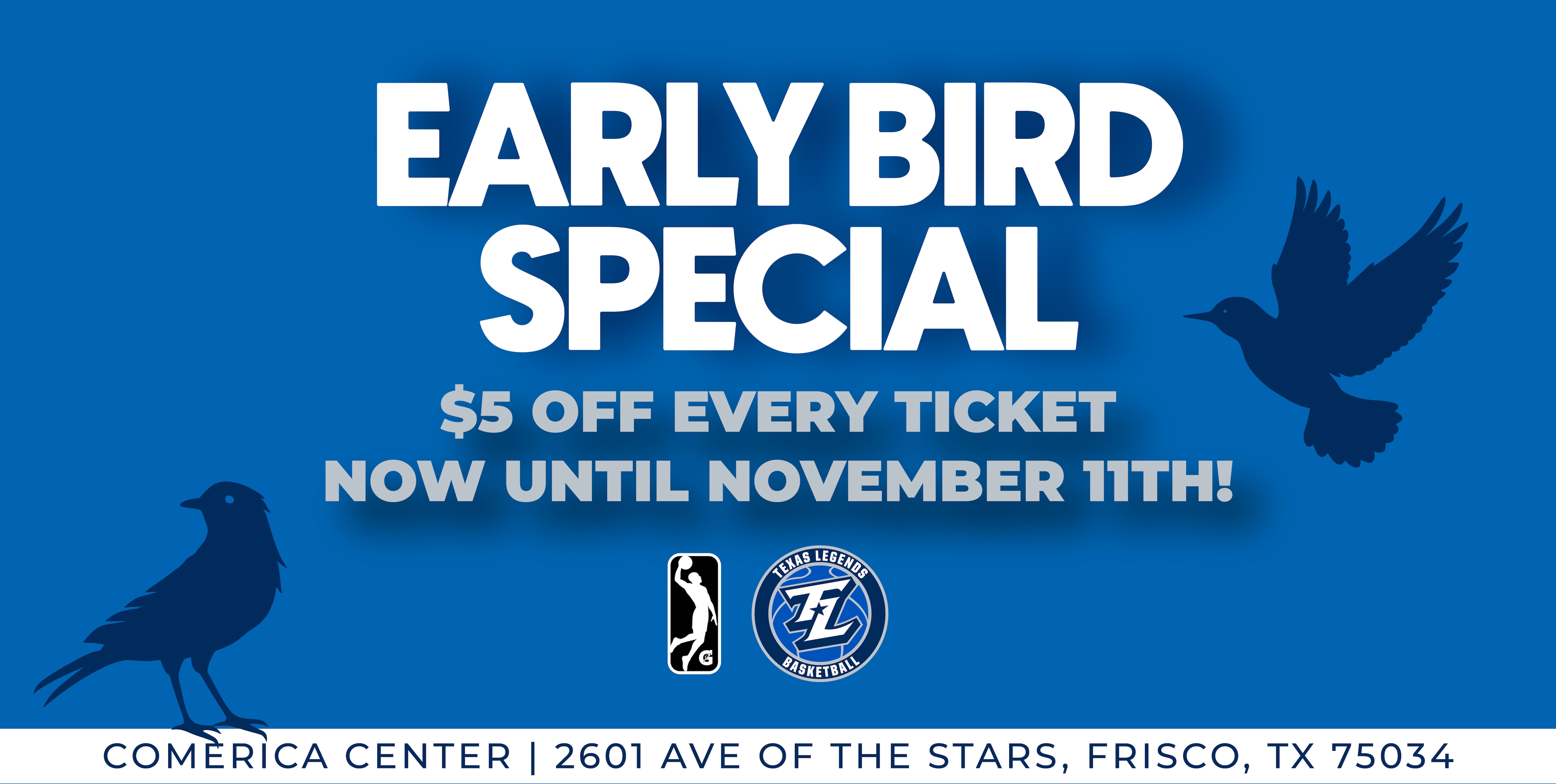 SAVINGS ALERT! Lock in $5 OFF EVERY TICKET you buy for the entire Texas Legends season! Whether you come once or ten times, you save five bucks on every seat.